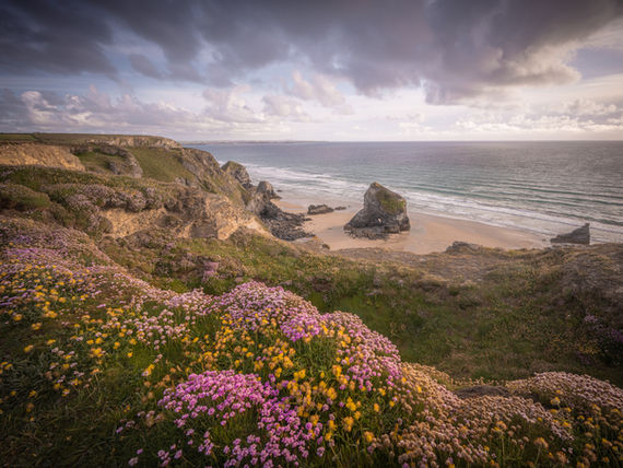 Wild flowers adorn the cliff top at Bedruthan Steps in late spring.