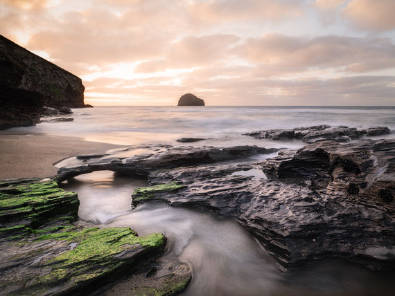Winter sunset at low tide, Trebarwith Strand, near Tintagel, North Cornwall.