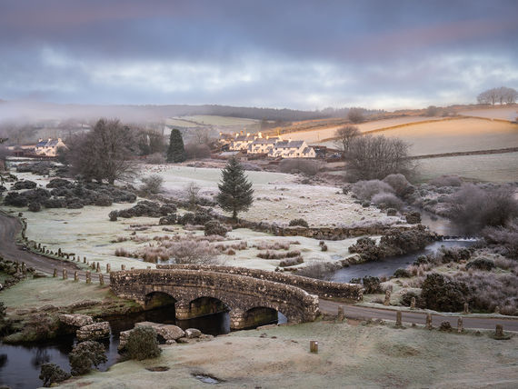 The tiny hamlet of Bellever is bathed in warm light as the sun rises on a frosty January morning.